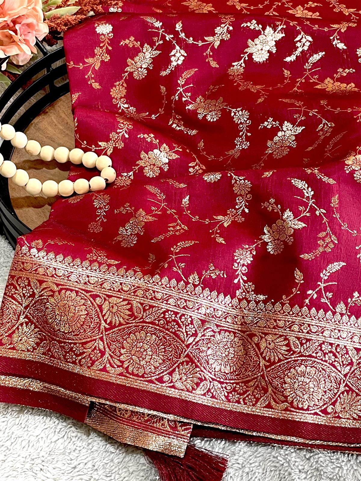 Elegant Banarasi Katan saree in wine red, perfect for parties, weddings, Eid, and festive occasions. A classic choice for a graceful and sophisticated look.