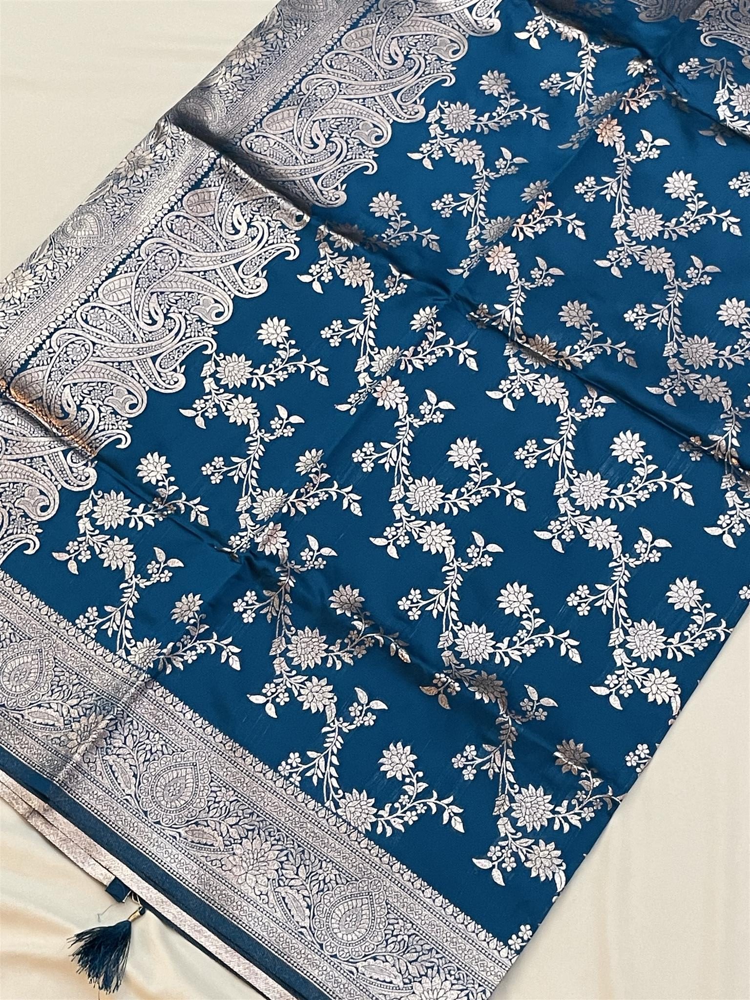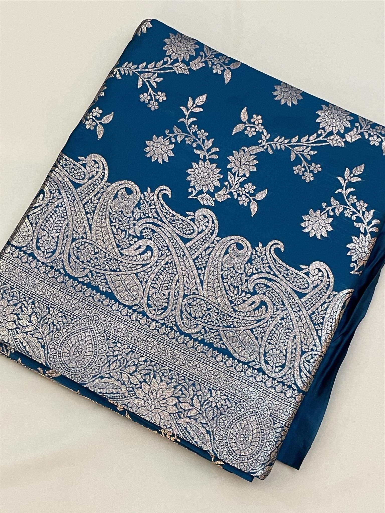Benaroshi Katan Saree – Peacock-Blue color body with blouse piece
