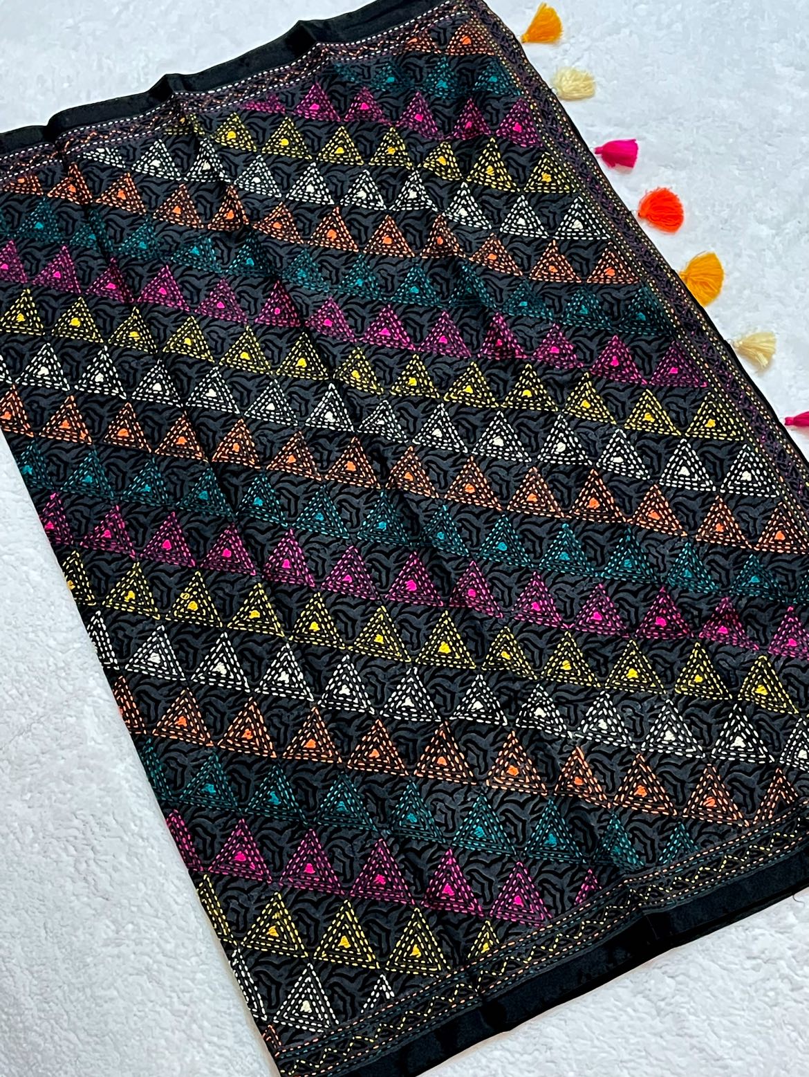 A stunning black Dupion silk saree with yellow, orange, blue & pink block and Kantha stitch work—perfect for any occasion or traditional program.