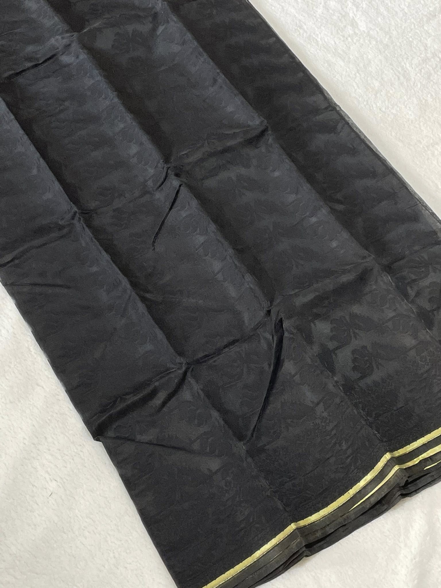 A classic black half silk machine-made Jamdani saree with a golden border line, perfect for everyday wear or small gatherings.