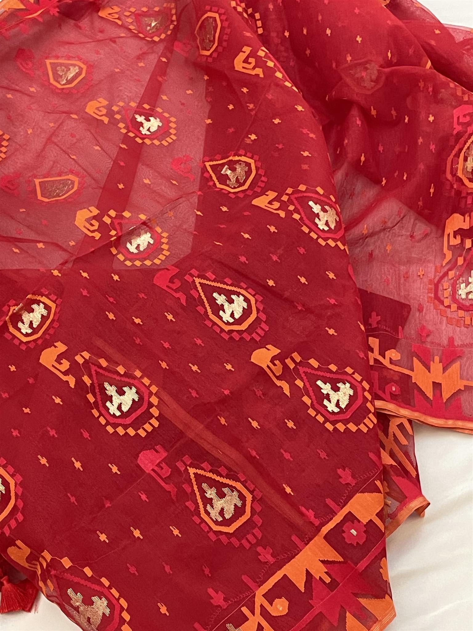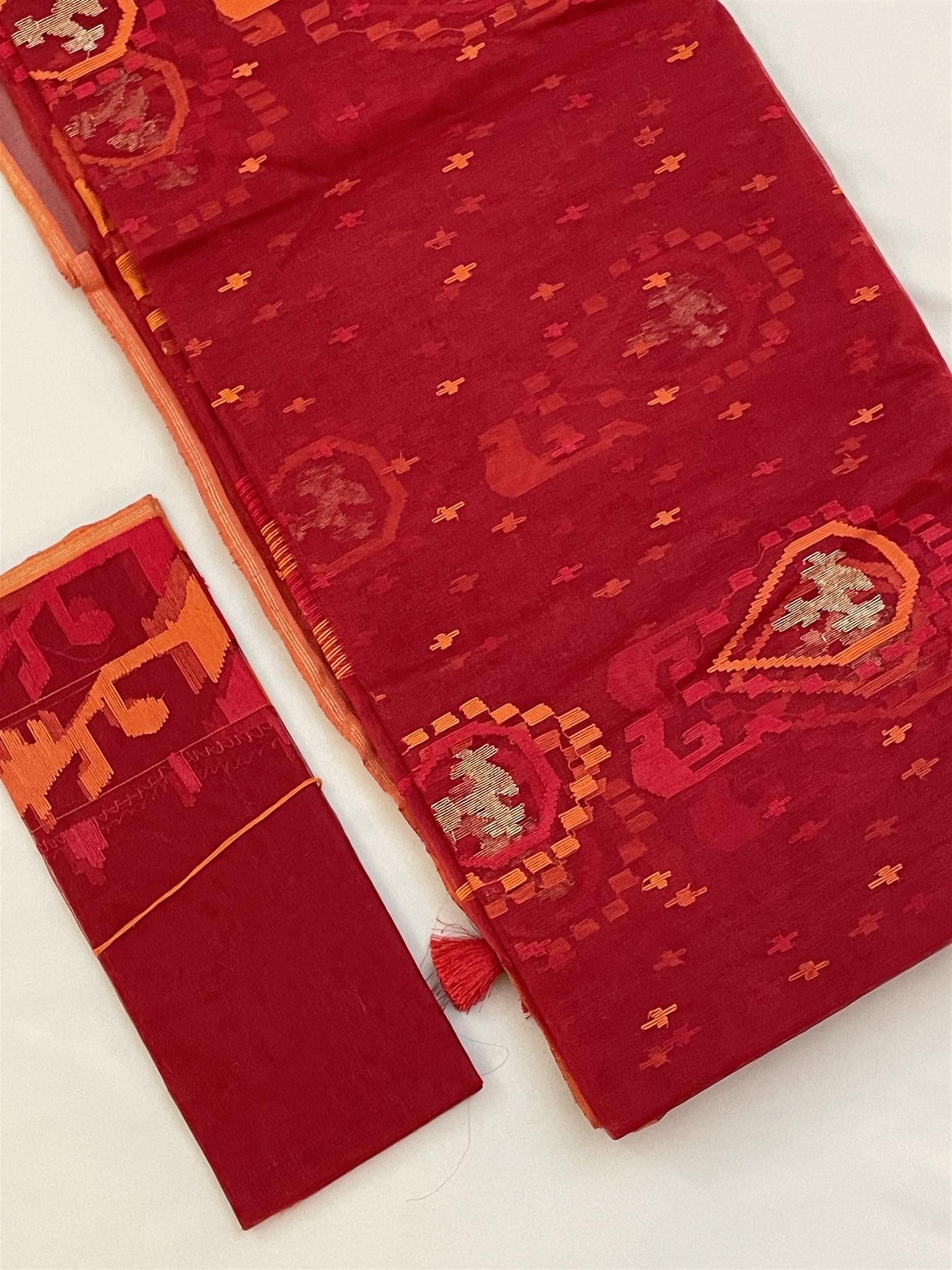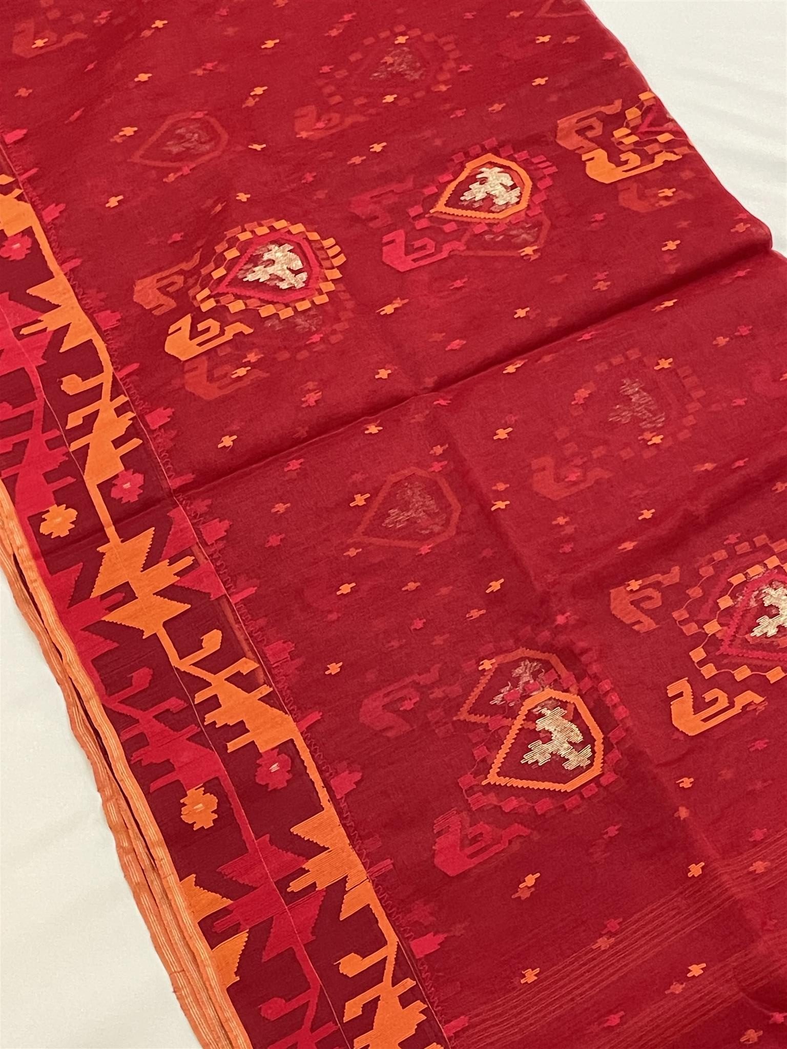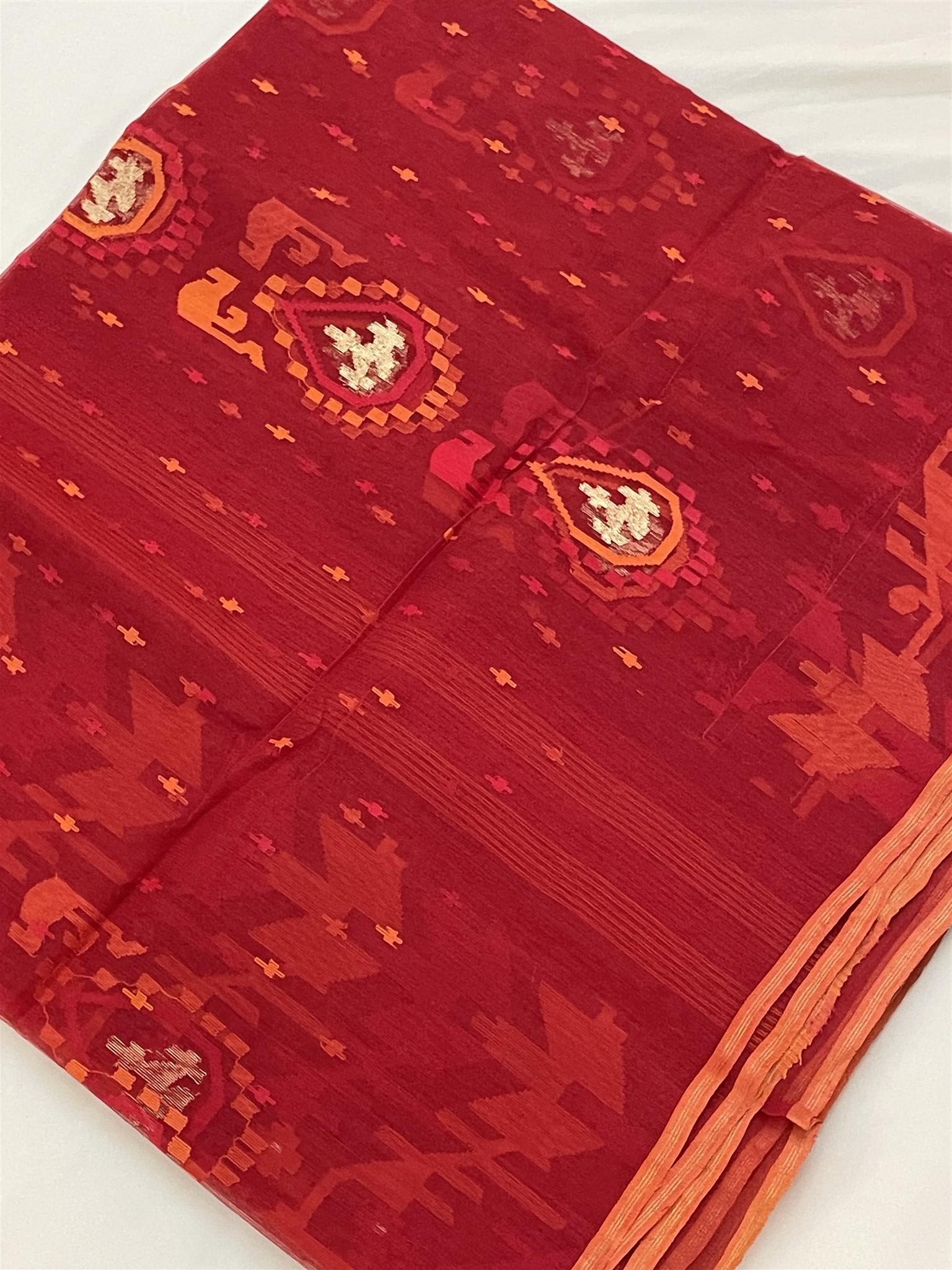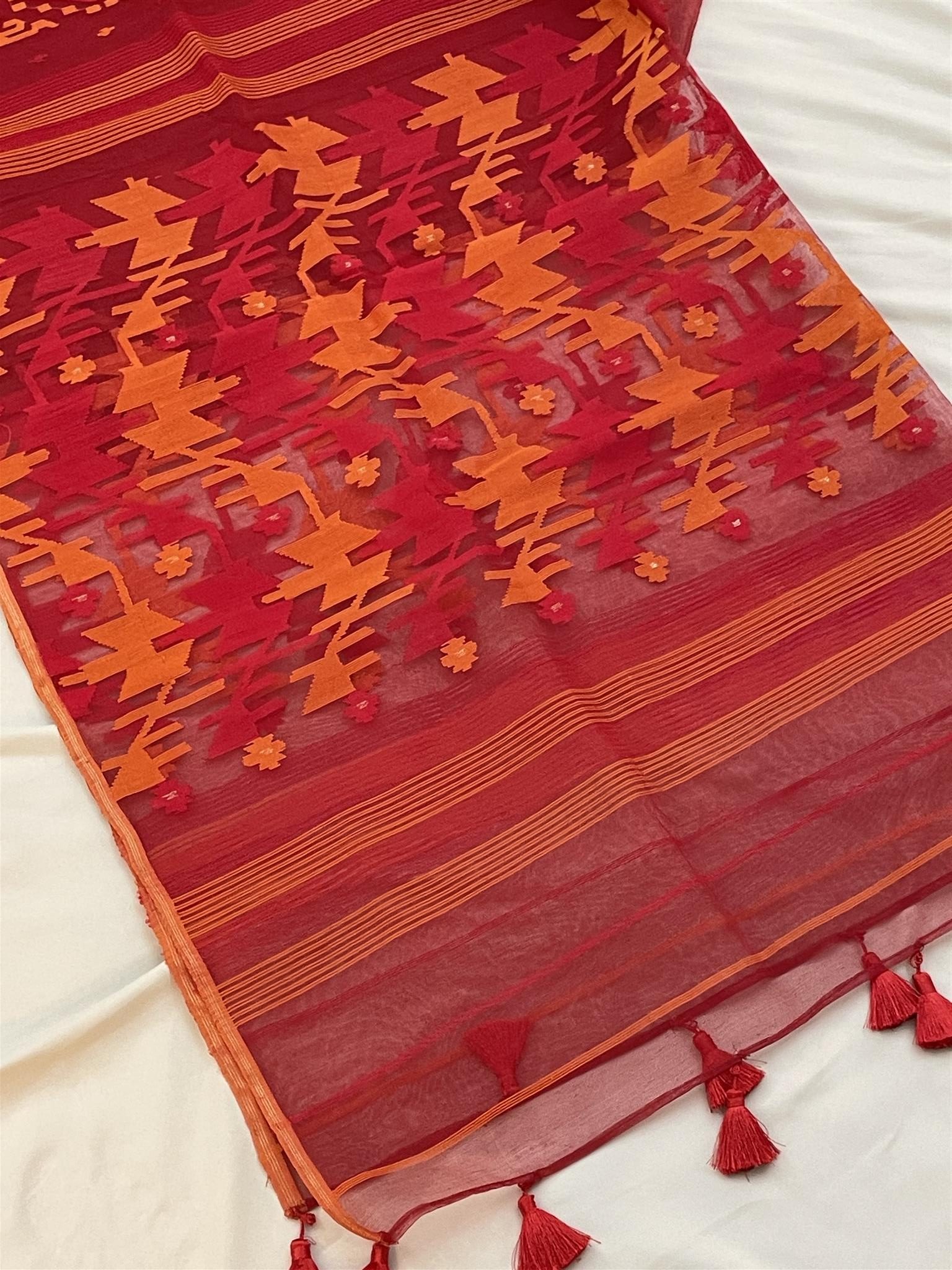 Jamdani Saree with Premium Quality 80 Count thread – Red, Orange color All over heavy work with Blouse piece