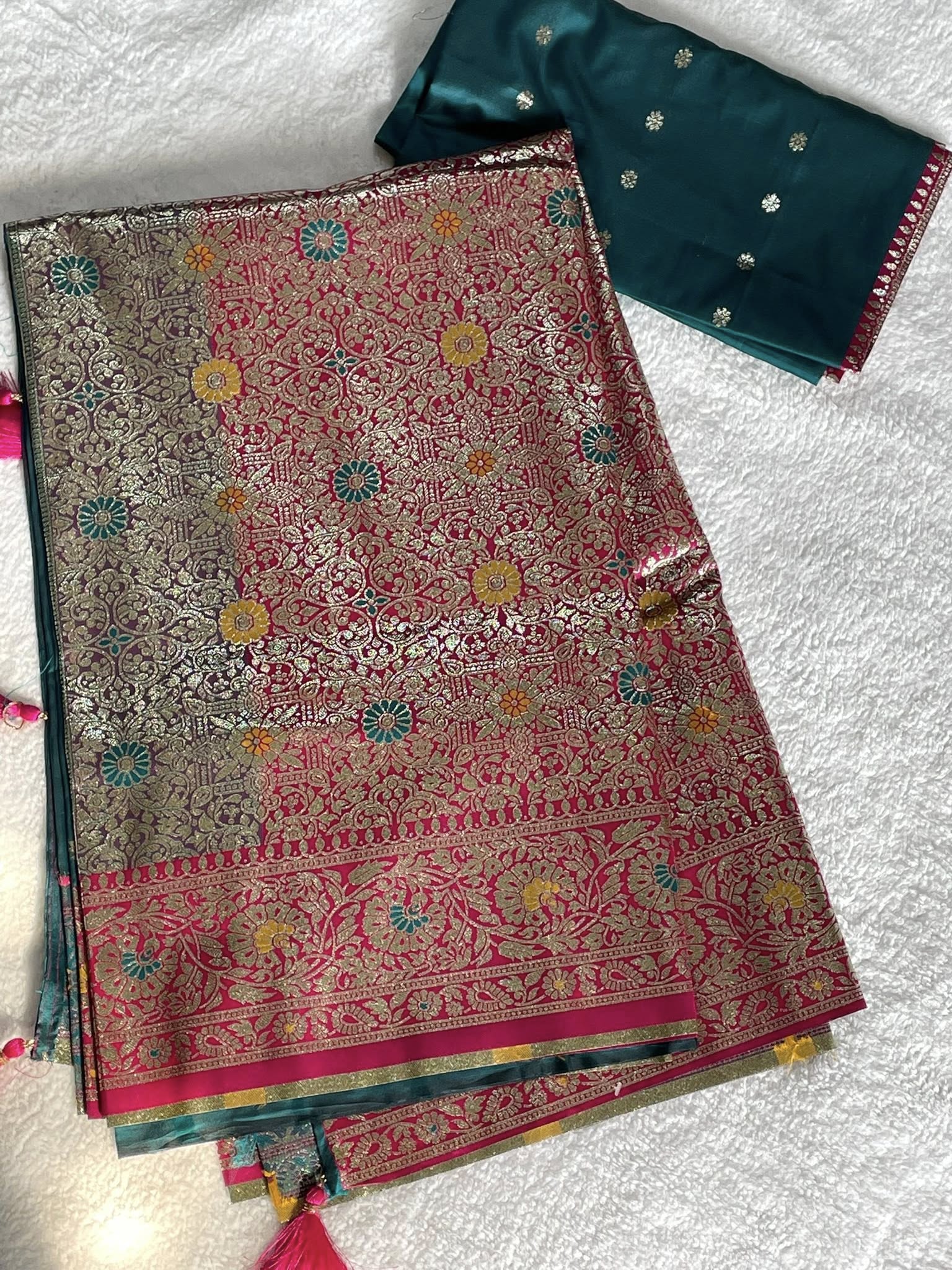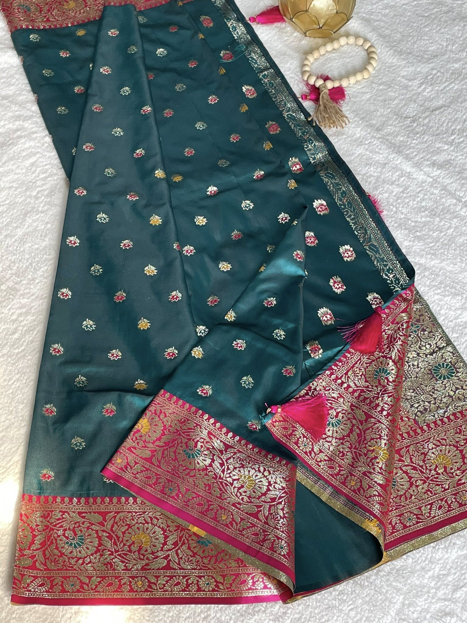 A vibrant teal-green & hot-pink Katan saree, perfect for parties and large gatherings.