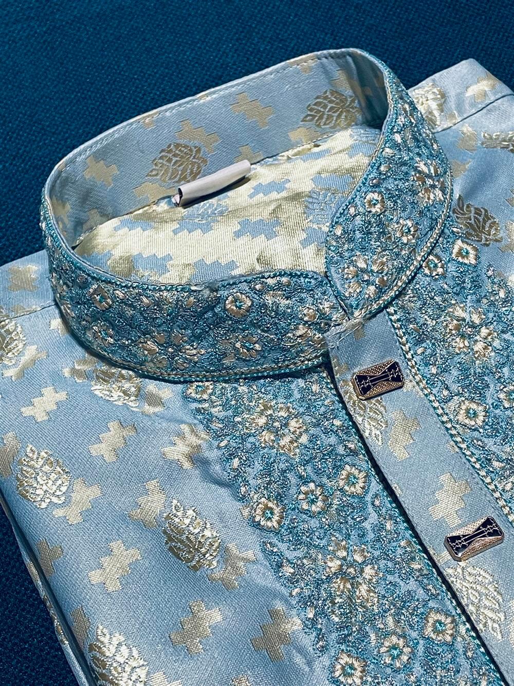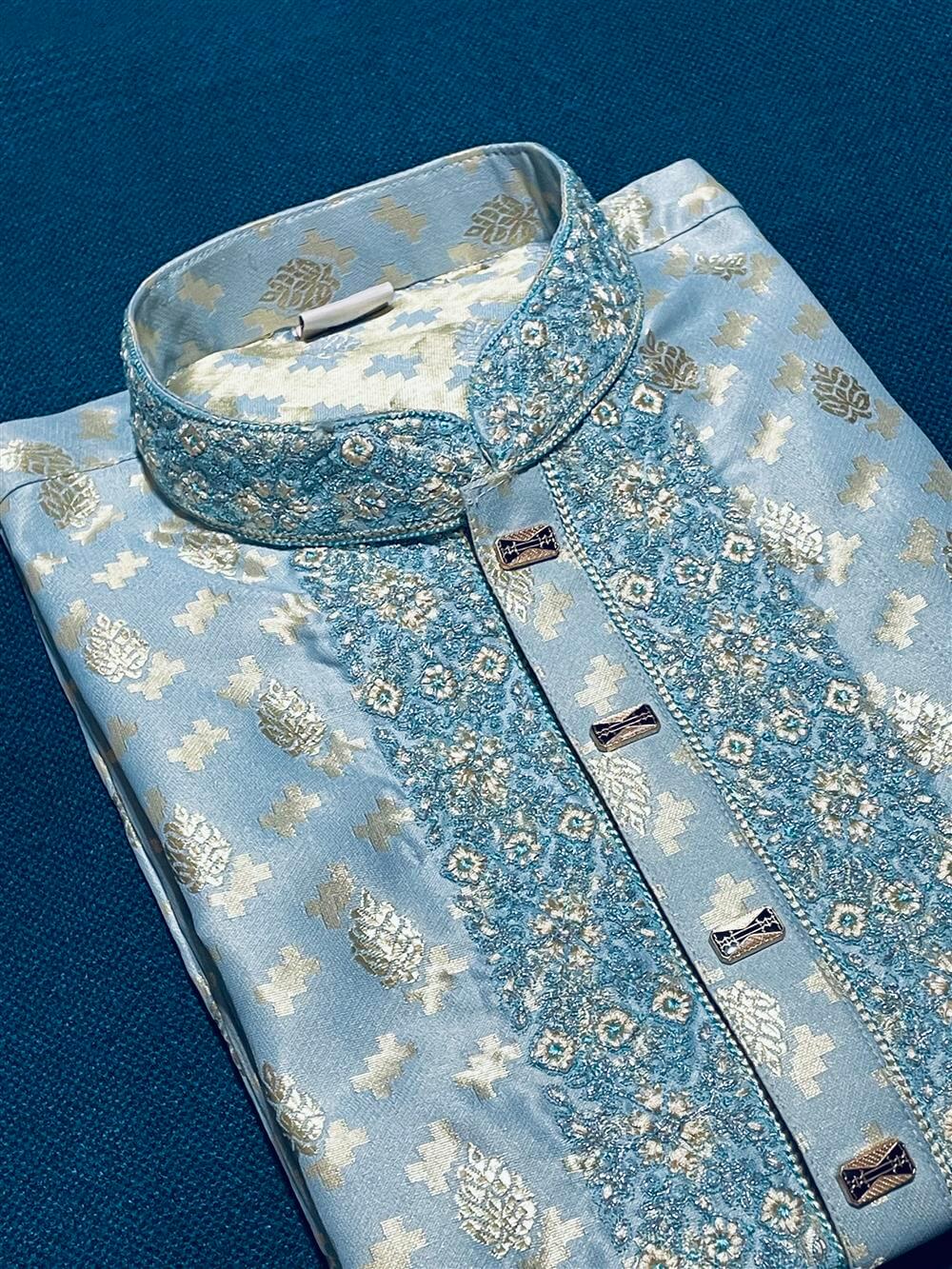 Men’s Silk Panjabi/Kurta – Embroidery work – Light-blue/Sky-blue color