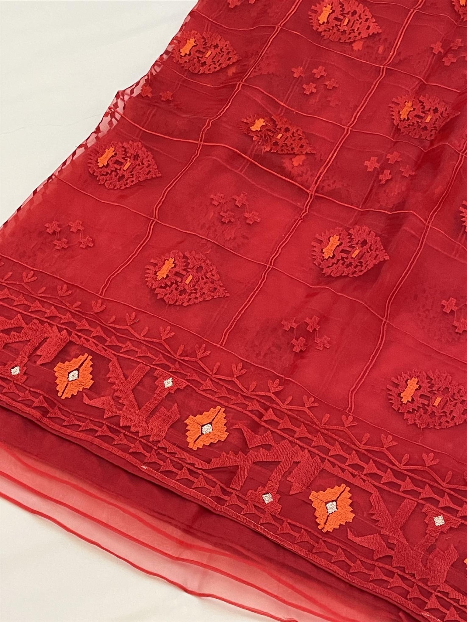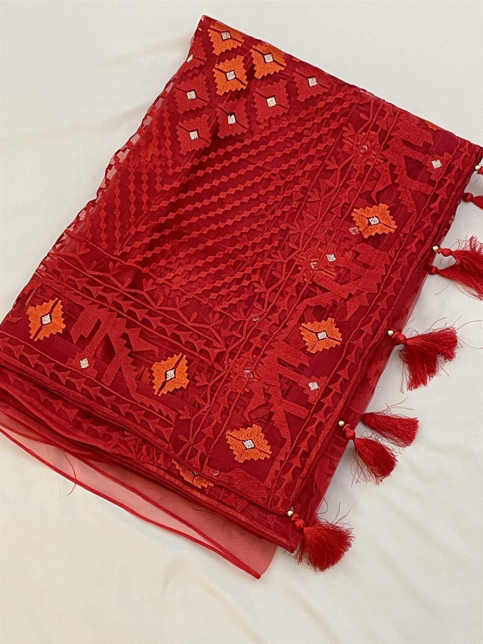 A luxurious red muslin saree with heavy Jamdani-inspired embroidery, tassel detailing, and a matching blouse piece; perfect for weddings, parties, Eid, and special occasions.