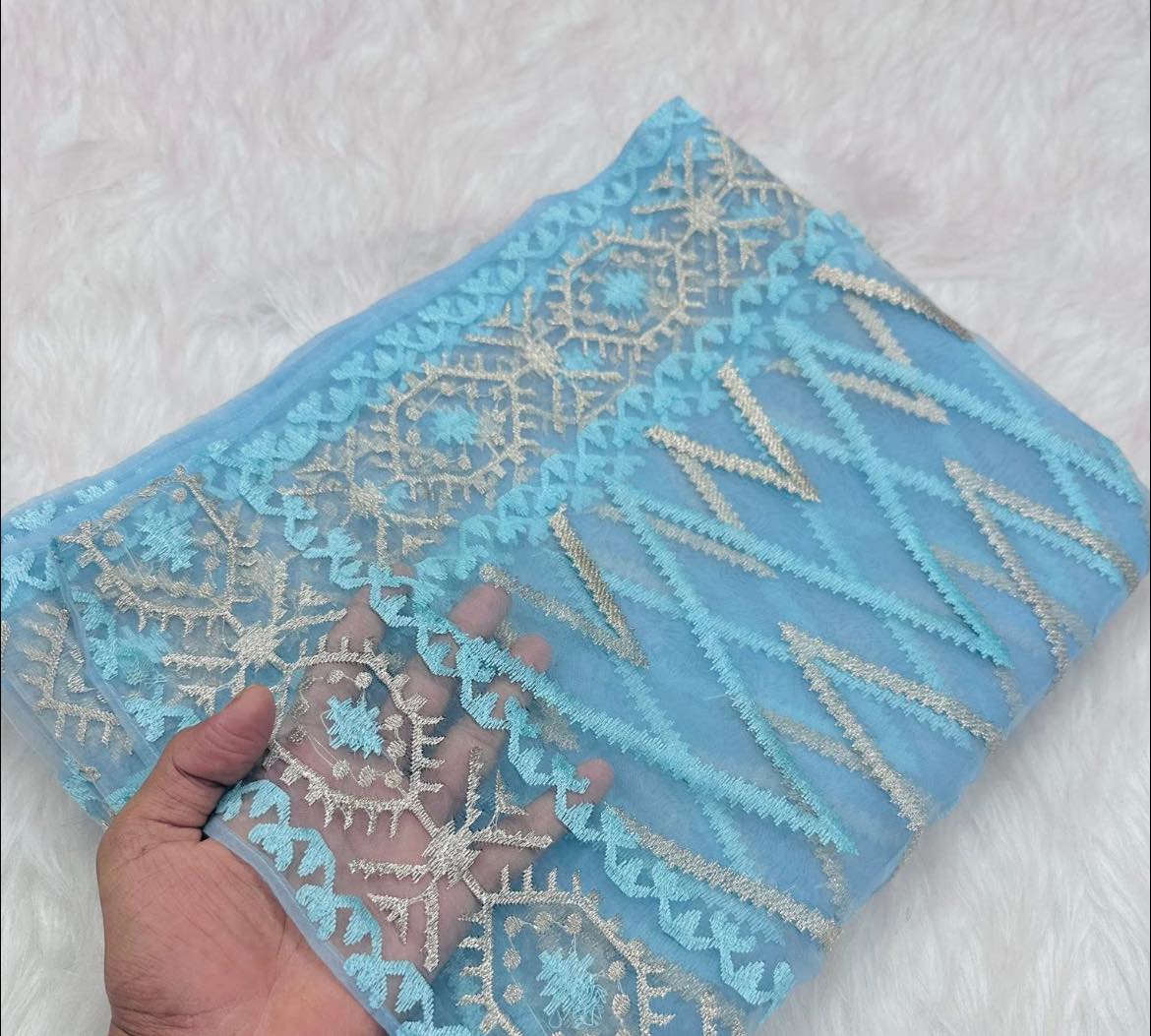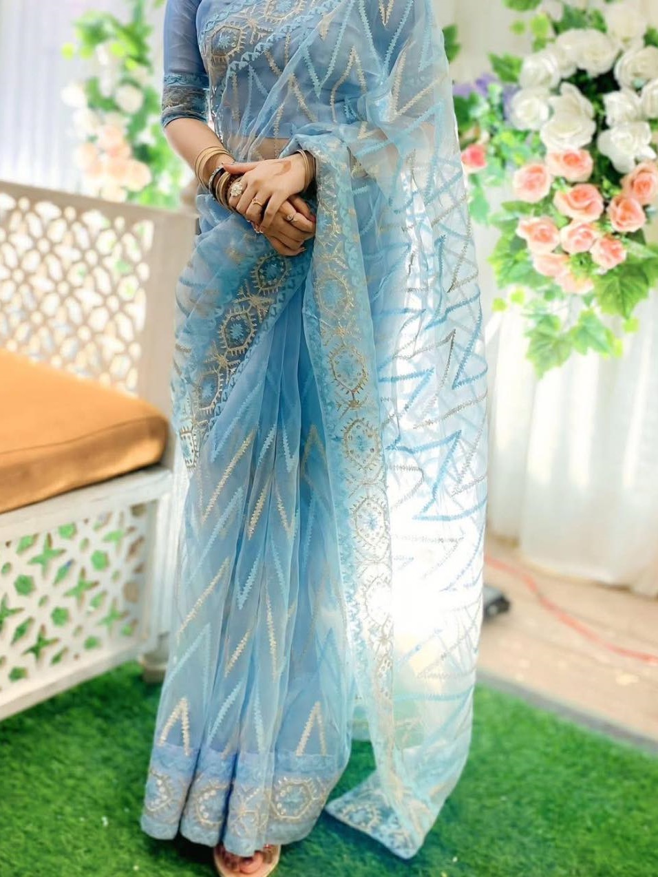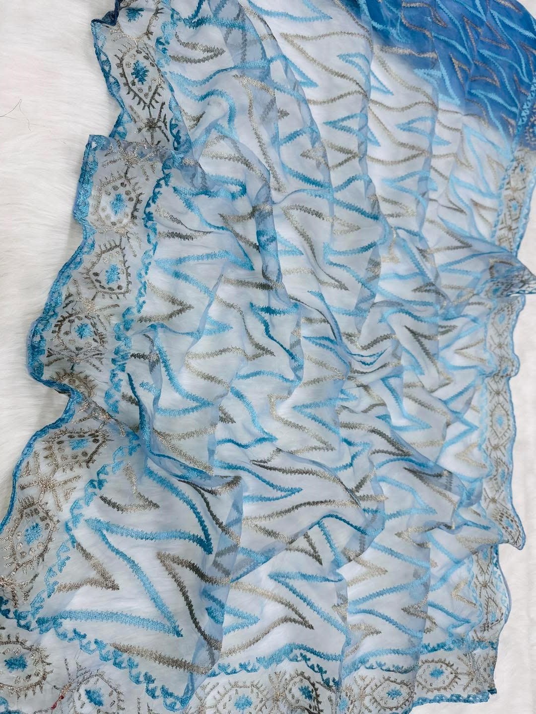 Organza Muslin Embroidered Saree with matching blouse piece – cute Light Blue color