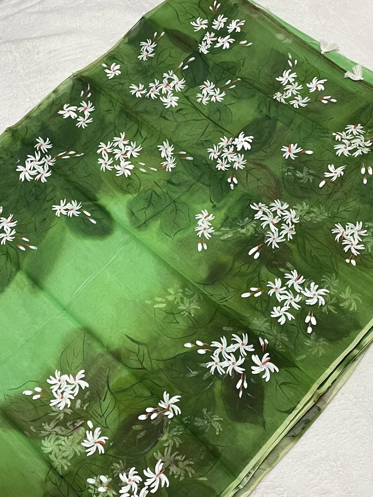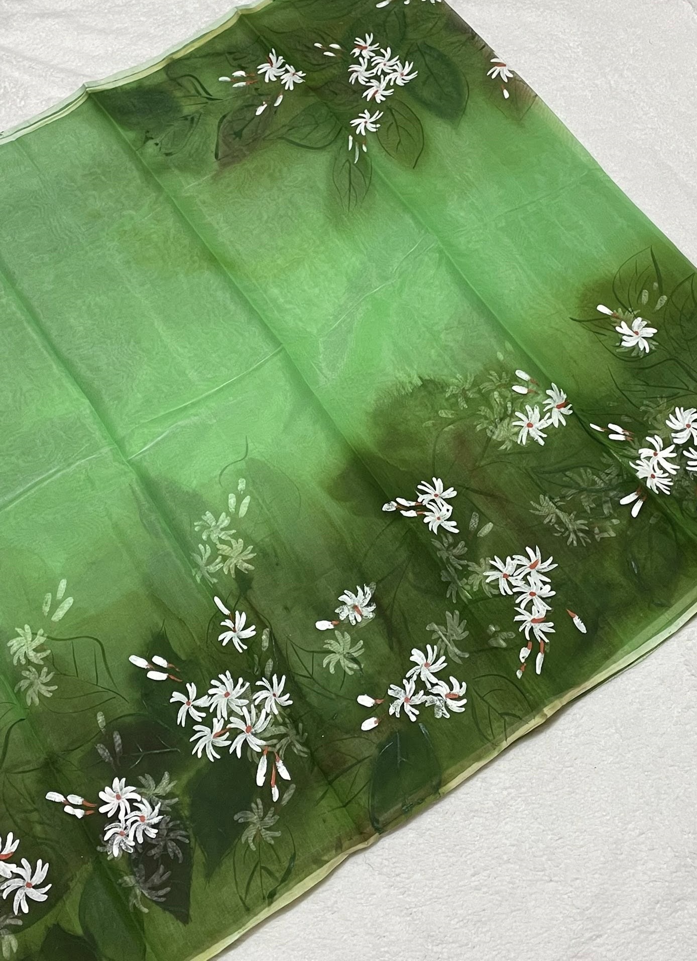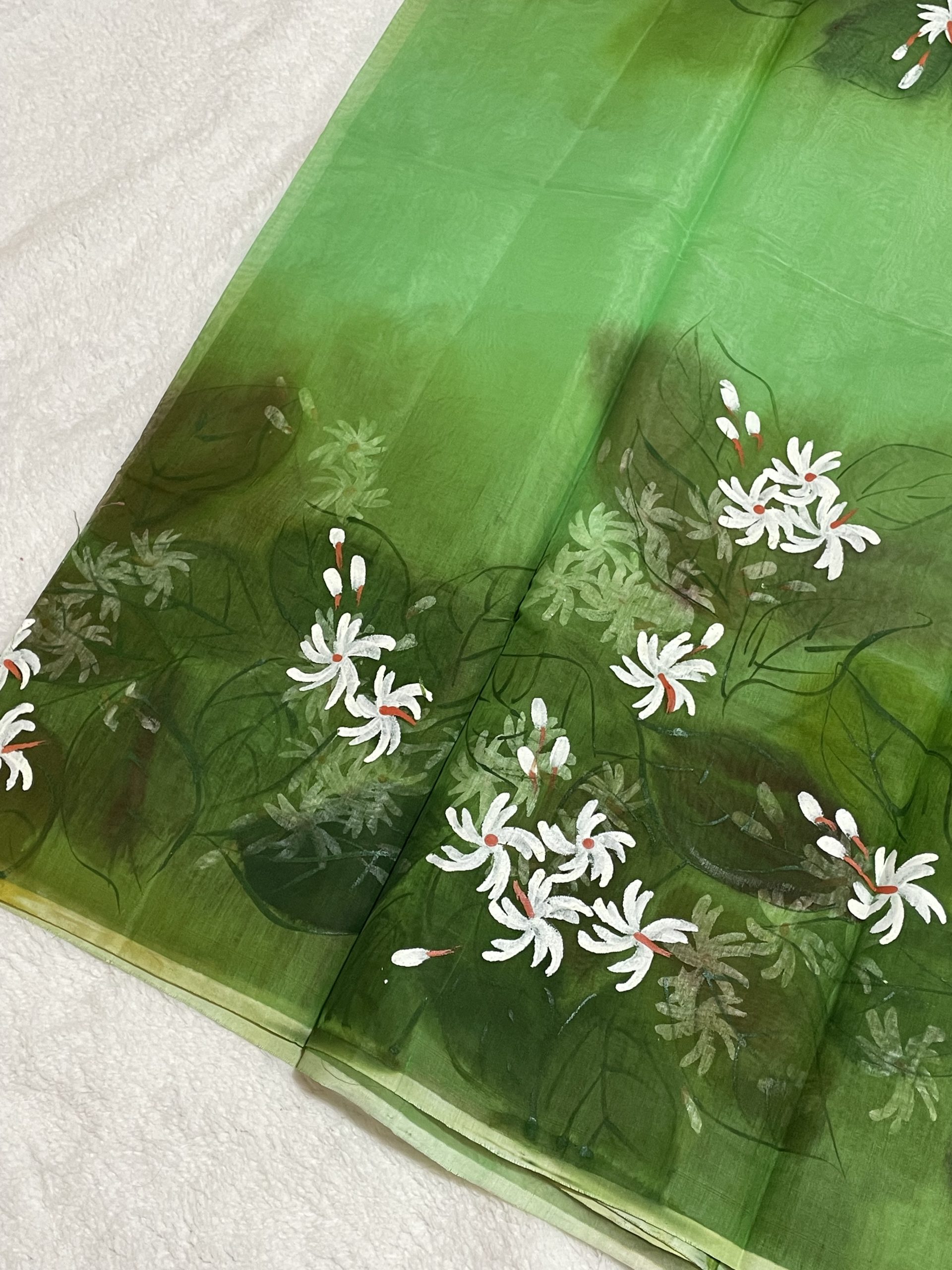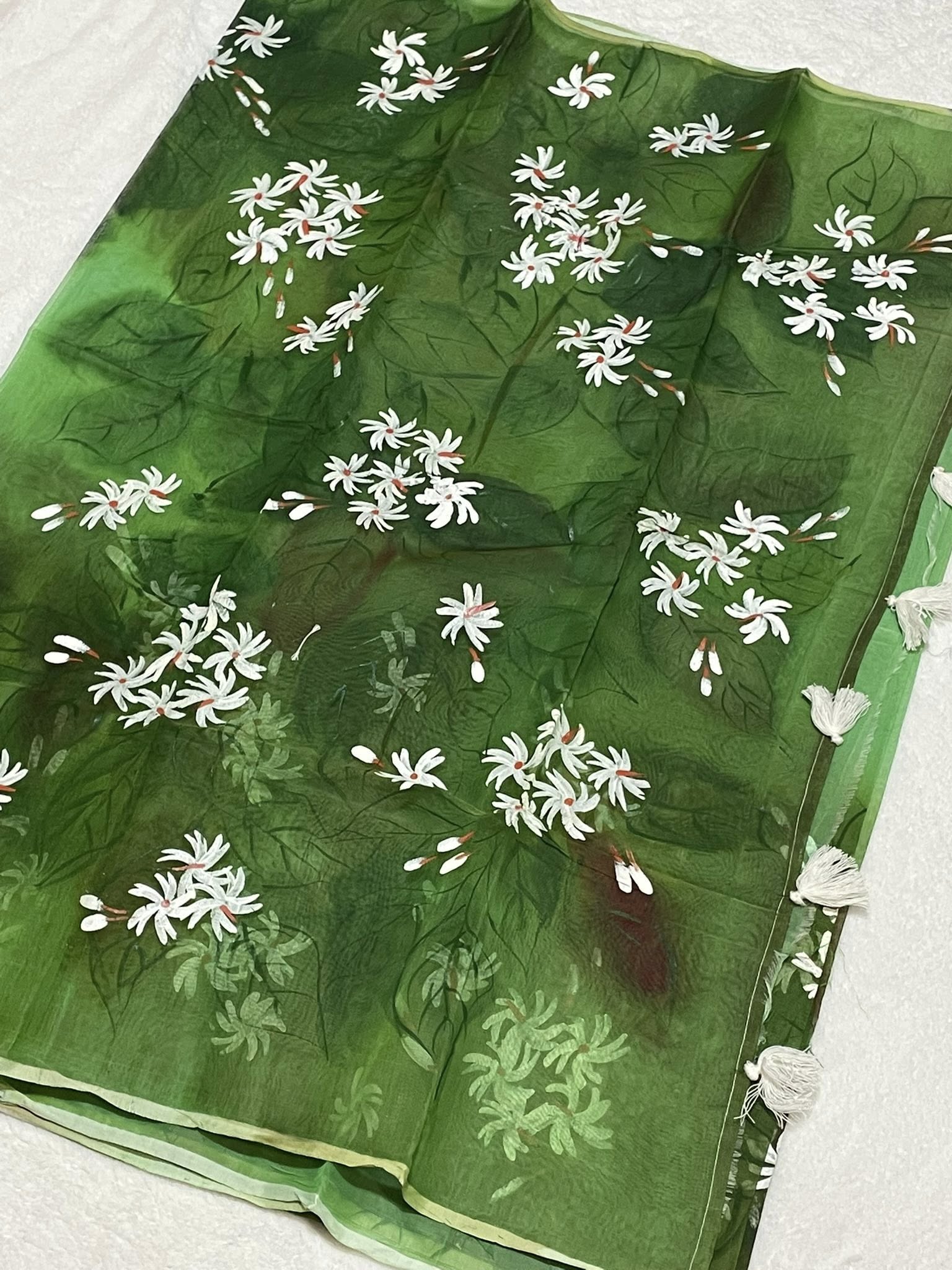 Semi-Muslin Brush-painted/ Hand-painted floral design Saree – Green color with white Shiuli flower