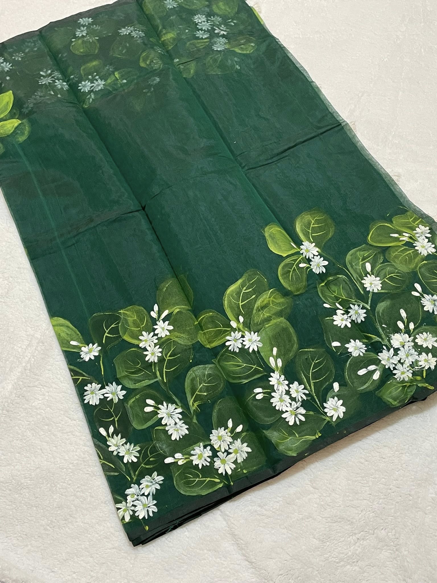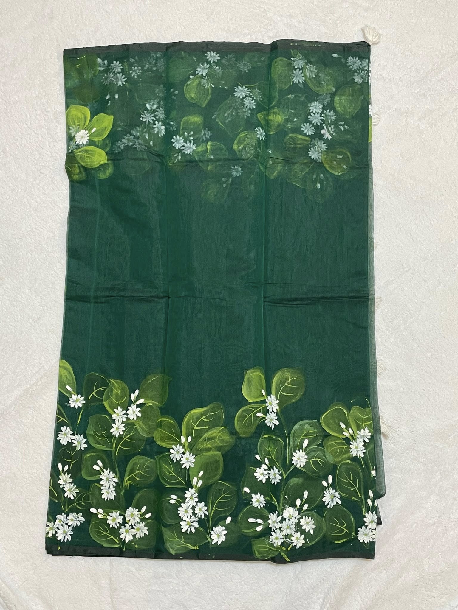 Refresh your ethnic style with this Semi-Muslin Hand-Painted Saree in a rich green shade, beautifully highlighted with delicate white floral designs. Soft, lightweight, and breathable, it drapes effortlessly for all-day comfort. Perfect for casual outings, parties, or cultural wear, this saree blends artistic charm with graceful elegance.