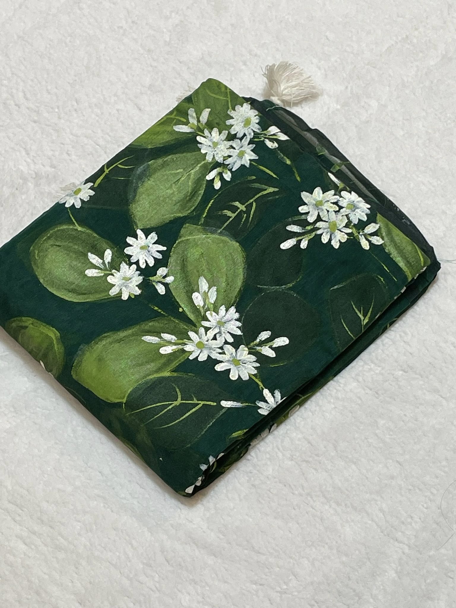 Semi-Muslin Brush-painted/ Hand-painted floral design Saree – Green color with white Jasmine flower