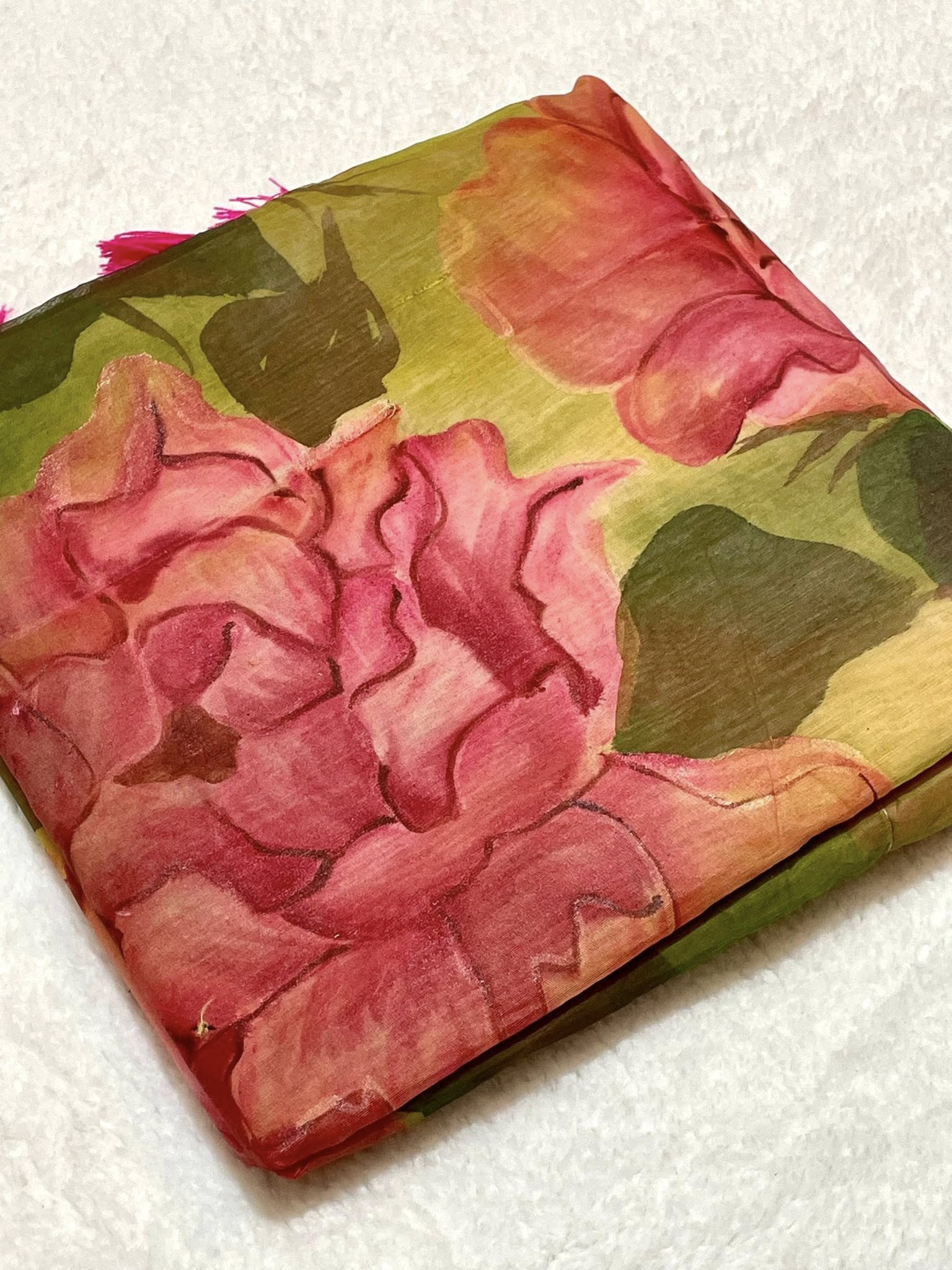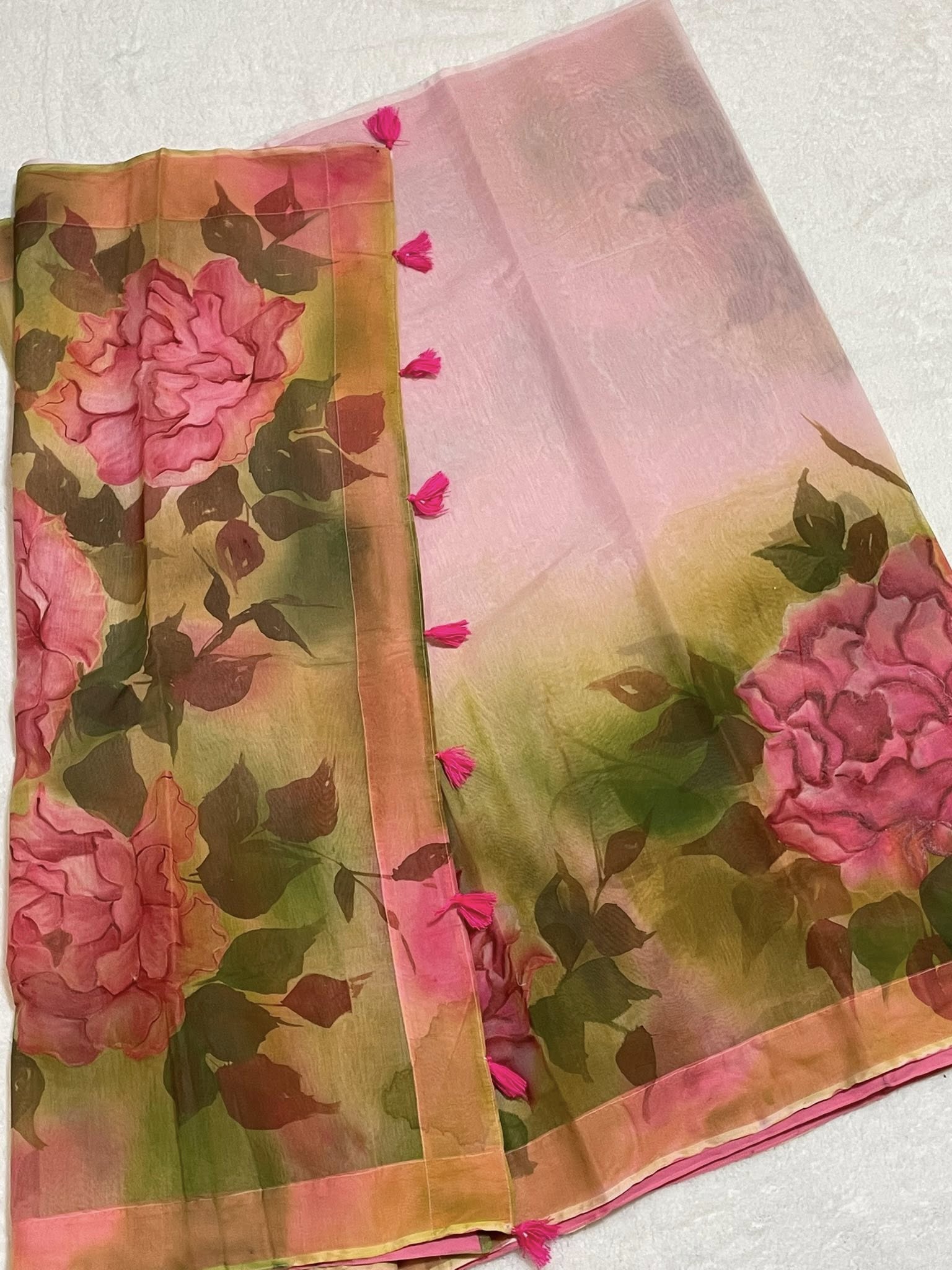 Semi-Muslin Brush-painted/ Hand-painted floral design Saree – Light Pink color with Pink/Red flower