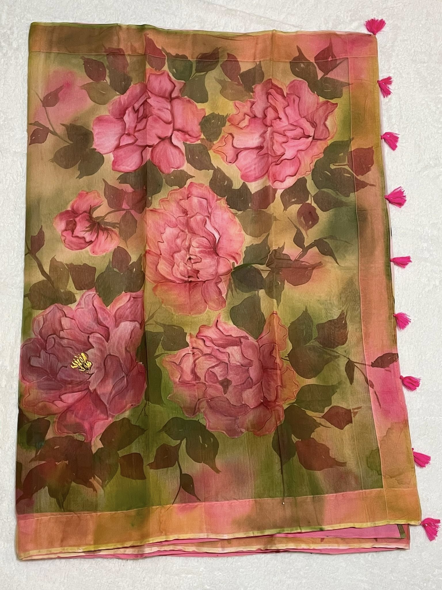 A soft light-pink semi-muslin saree with pink & red hand-painted floral designs, perfect for casual wear, parties, or cultural/desi events.