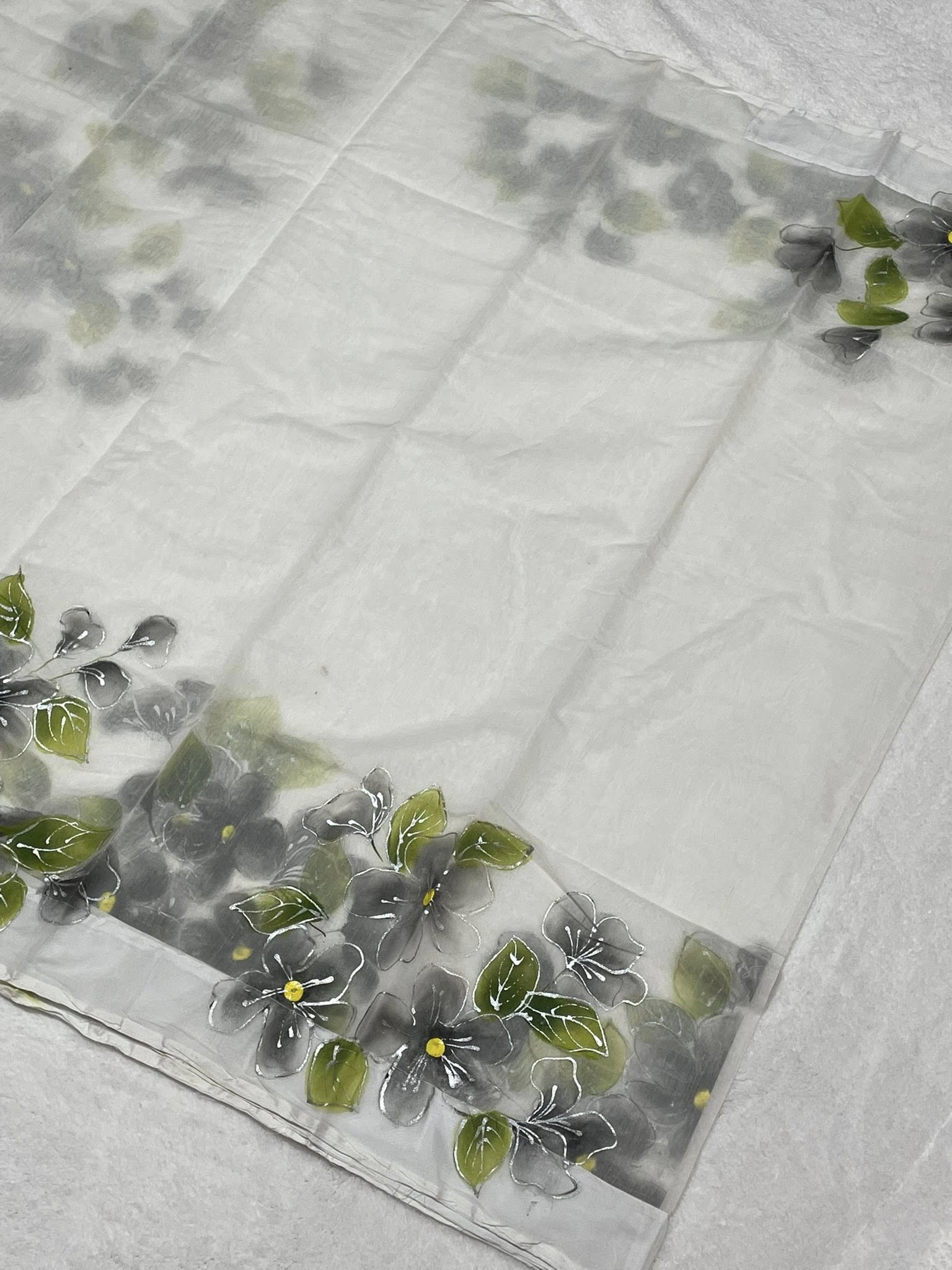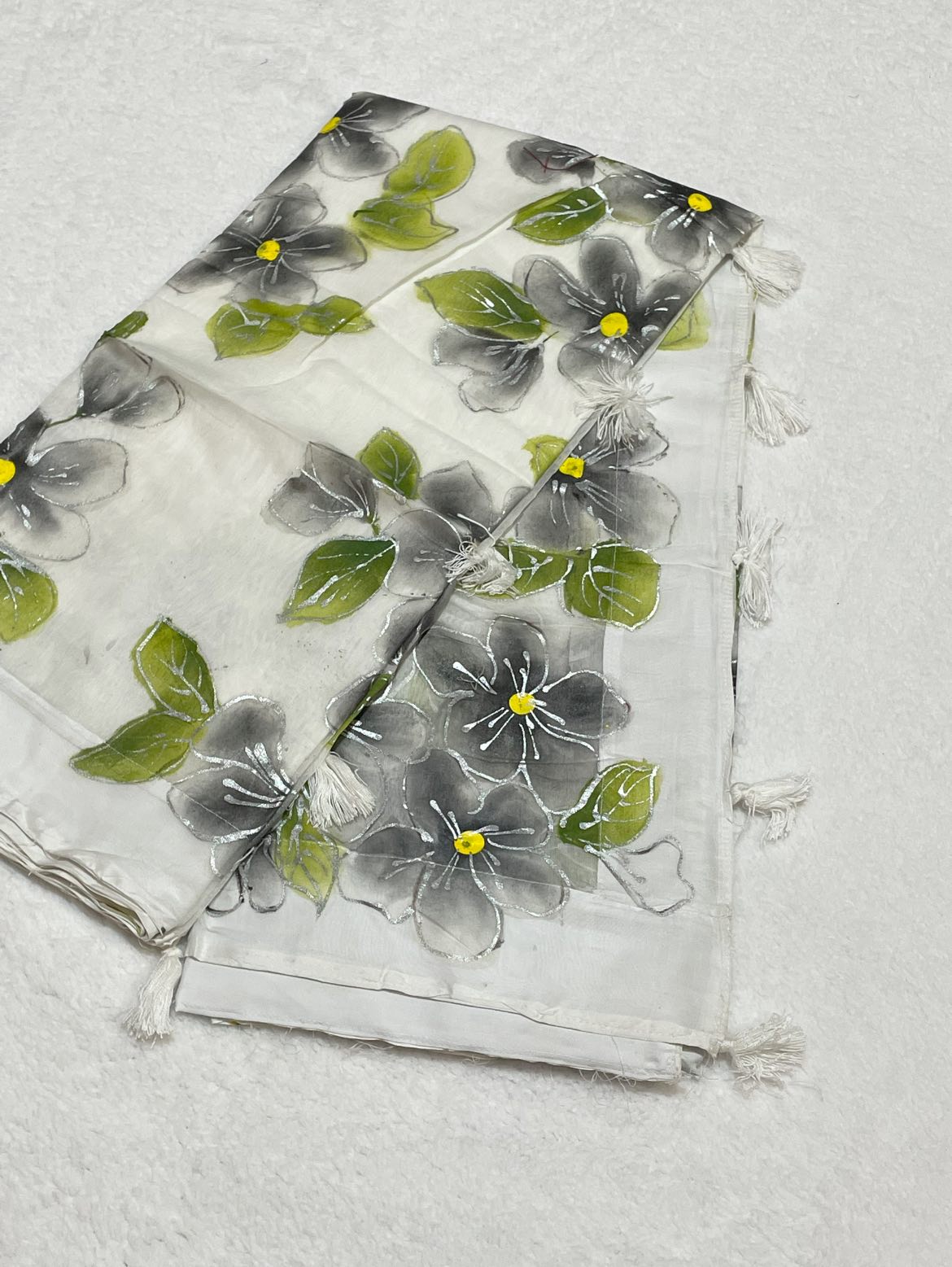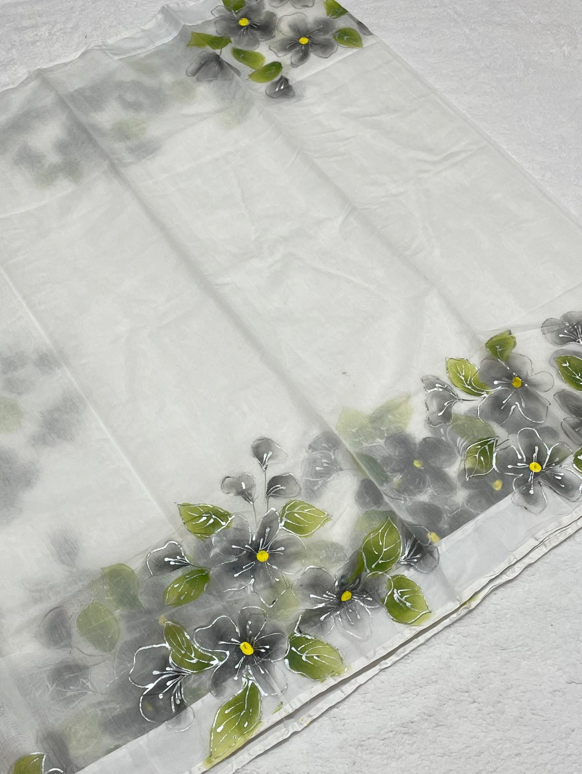 A soft white & green semi-muslin saree with gray hand-painted flowers and green leaves, perfect for casual wear, parties, or cultural/desi events.
