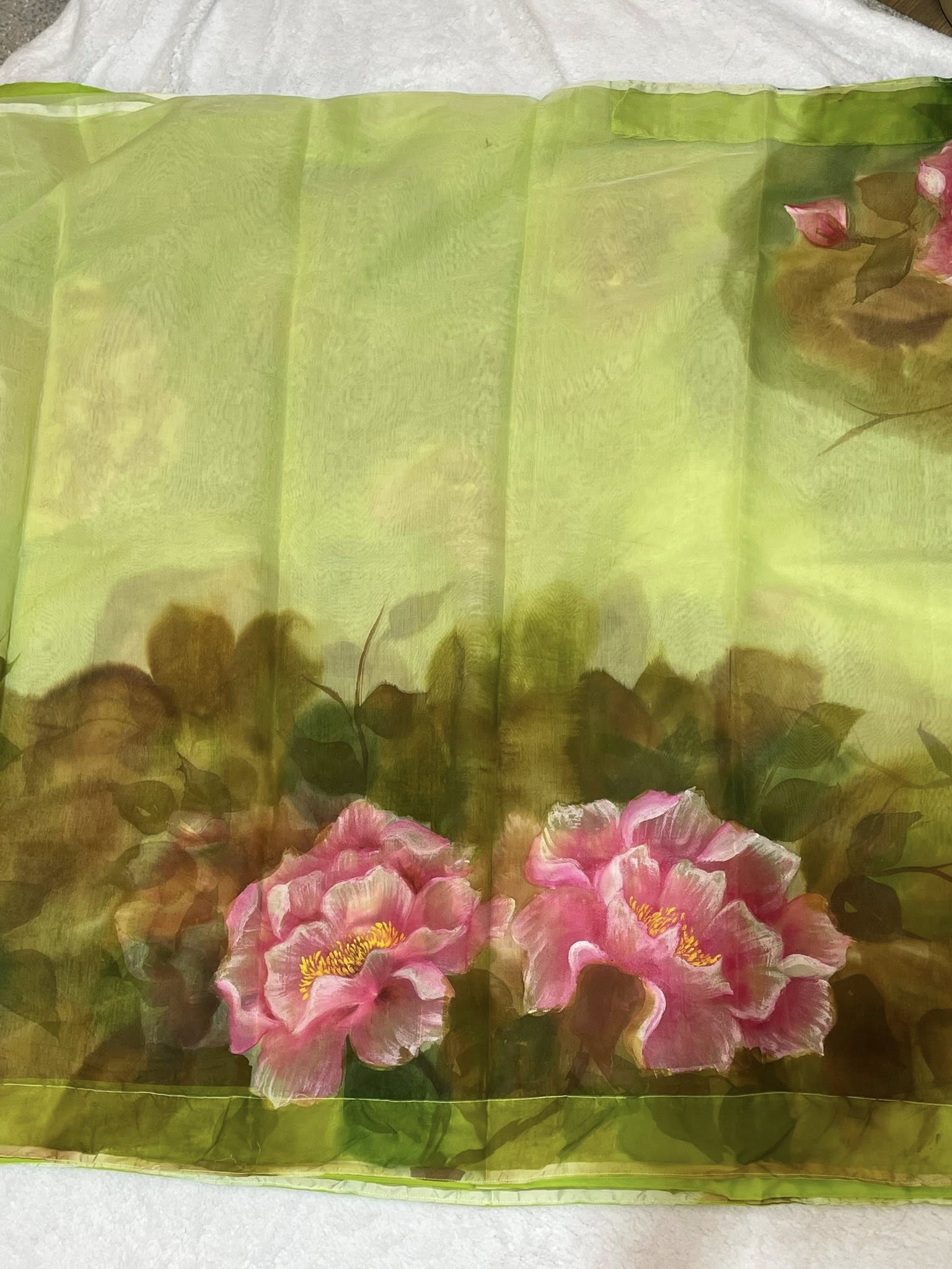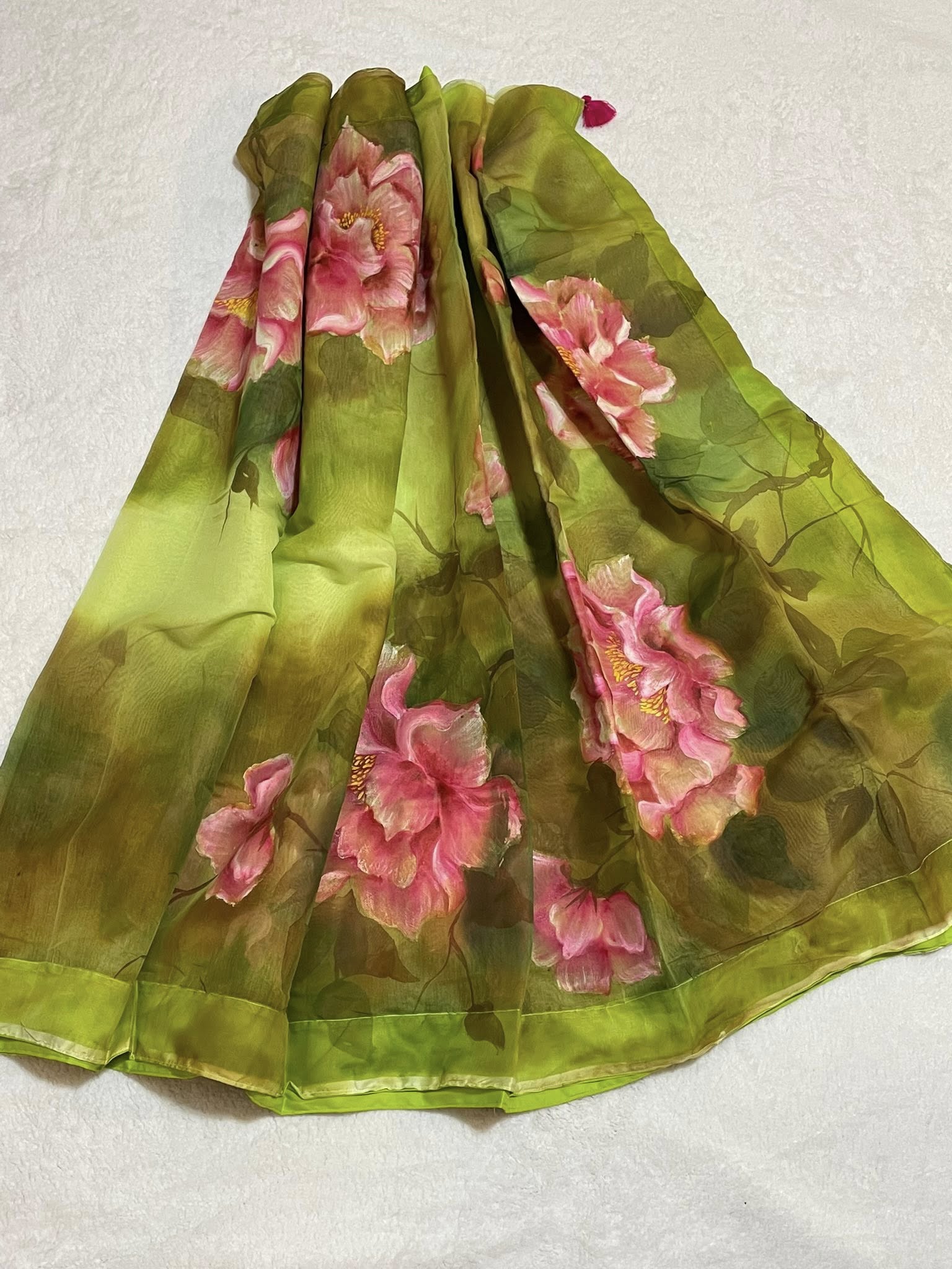 Semi-Muslin Brush-painted/ Hand-painted Saree – Green color with Pink flowers