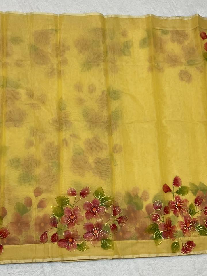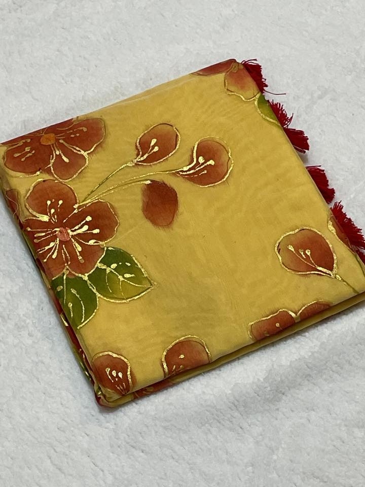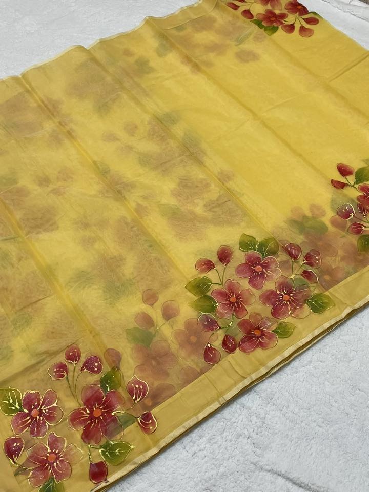 Brighten your look with this Semi-Muslin Hand-Painted Saree in a cheerful yellow shade. Adorned with beautiful hand-painted floral artwork, it offers a soft, airy feel and a vibrant style that stands out effortlessly. Perfect for casual outings, parties, or cultural/desi events, this saree brings artistic elegance to any occasion.