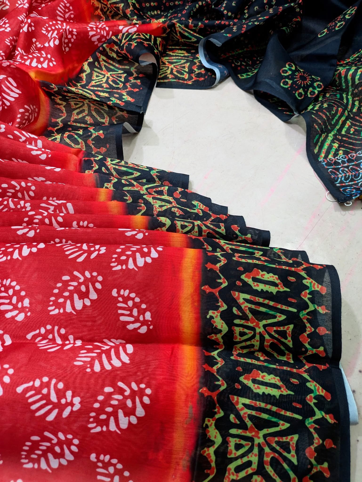 A rich red silk handcrafted batik saree, perfect for casual, party & cultural wear, ideal for both casual and festive occasions.