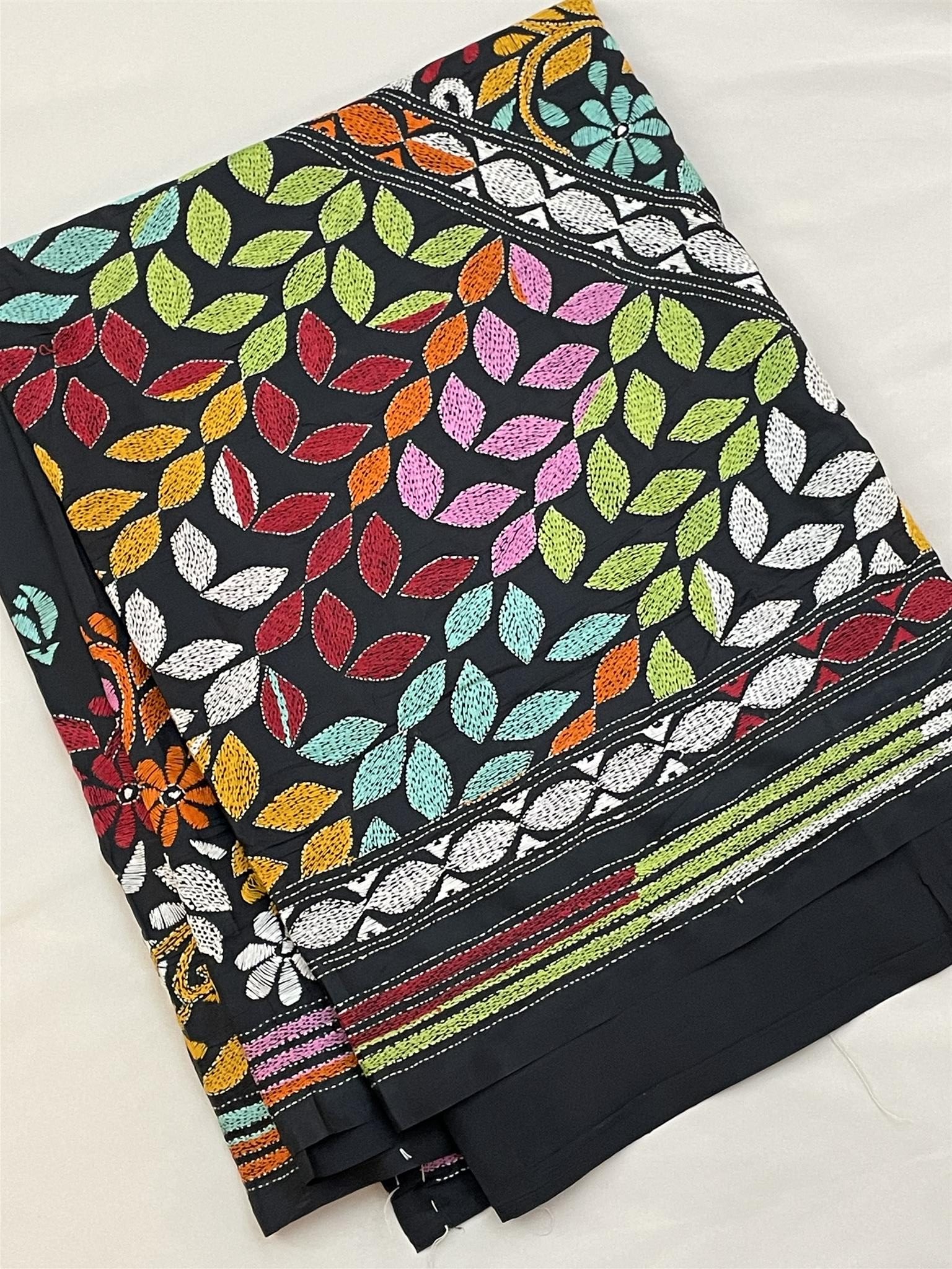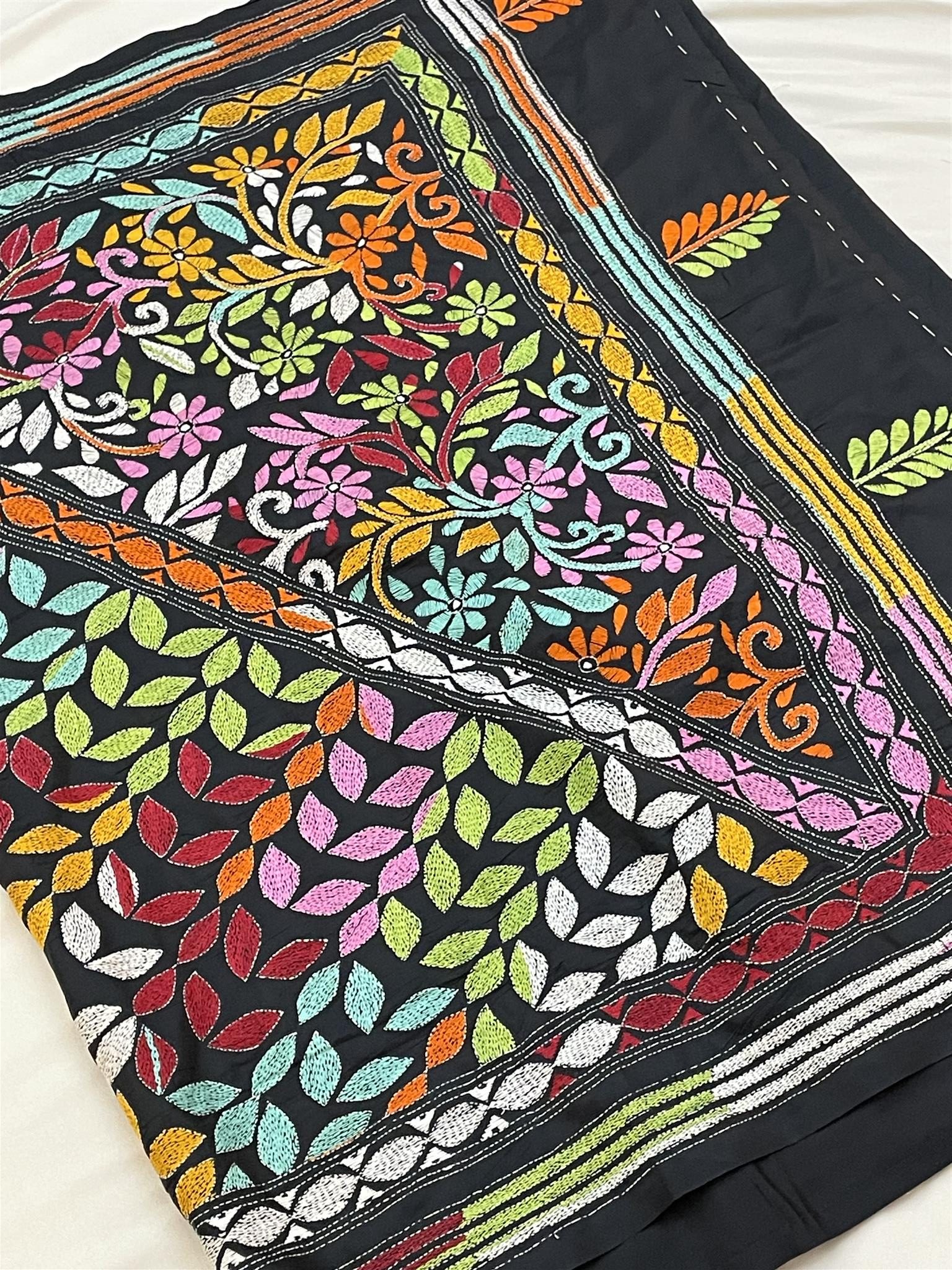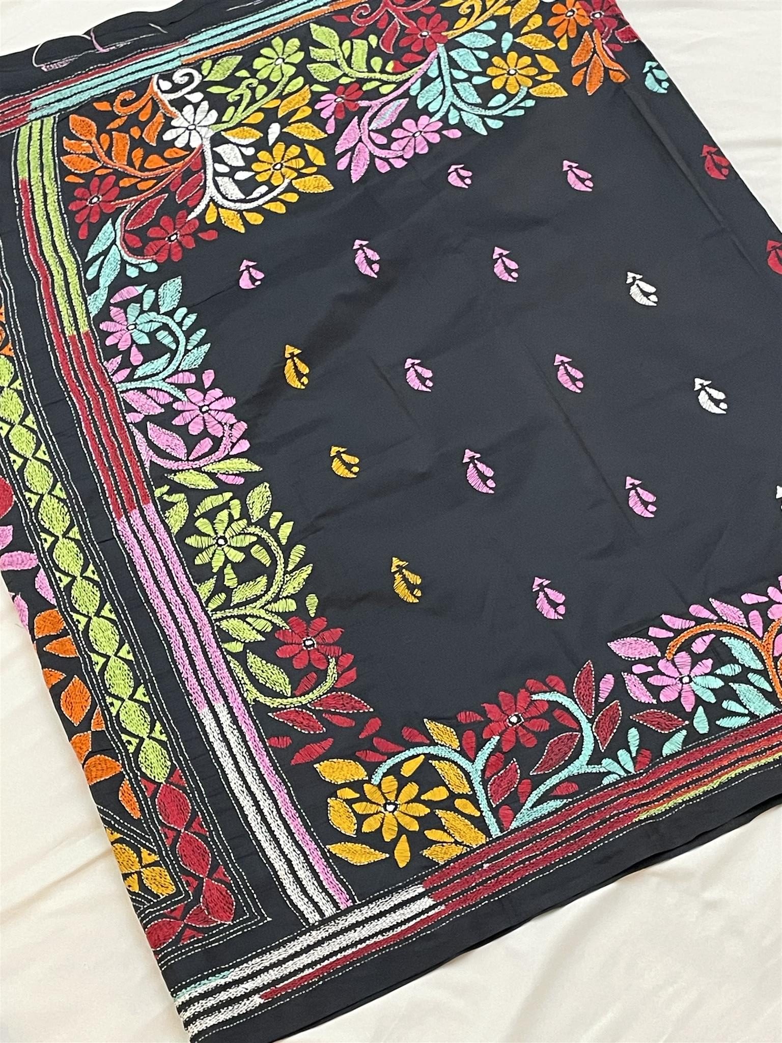 Elegant Silk Katha-Stitch saree in black with multi-color handwork, includes matching blouse piece. Ideal for weddings, parties, Eid, and traditional occasions.