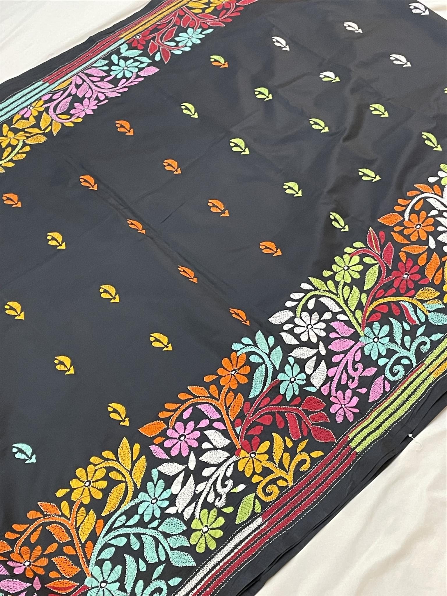 Silk Katha-Stitch (All-over Hand work) Black Saree with multi-color work with blouse piece